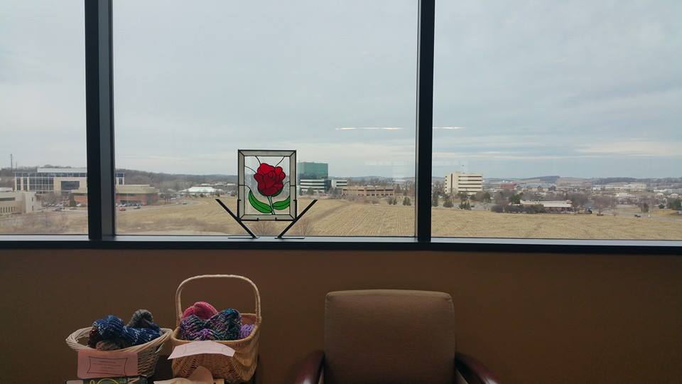 With my husband’s understanding, encouragement, and supportive arm, we walked into the building. It didn’t get any better inside. Still fighting back tears, I saw two wicker baskets full of knitted hats some kind souls labored over to help others feel a bit better. There was a pretty, purple one sitting on top.